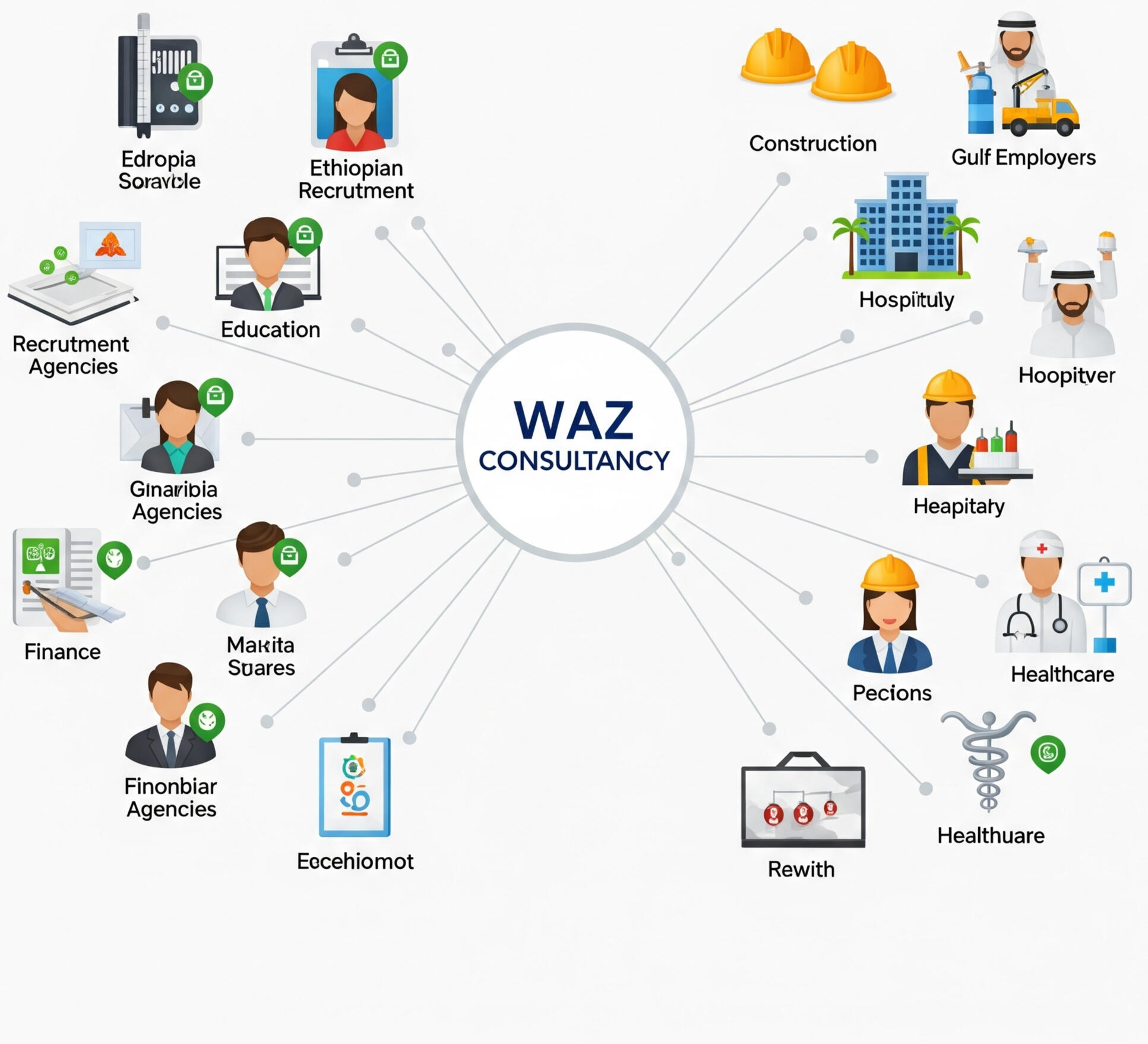 WAZ Consultancy exists to connect verified Ethiopian recruitment agencies with ethical international recruiters — especially in the Gulf region. Our mission is to make overseas job opportunities safer, more transparent, and more accessible for Ethiopian professionals by simplifying agency-to-agency matchmaking and removing unregulated middlemen.